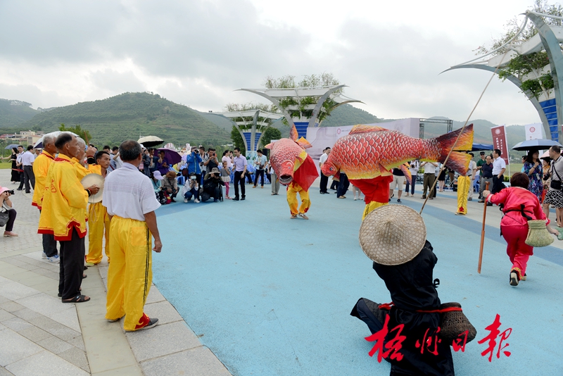 ????6月11日,在桂粵非遺大觀園梧州園,市民游客正觀看“鯉魚舞”表演。