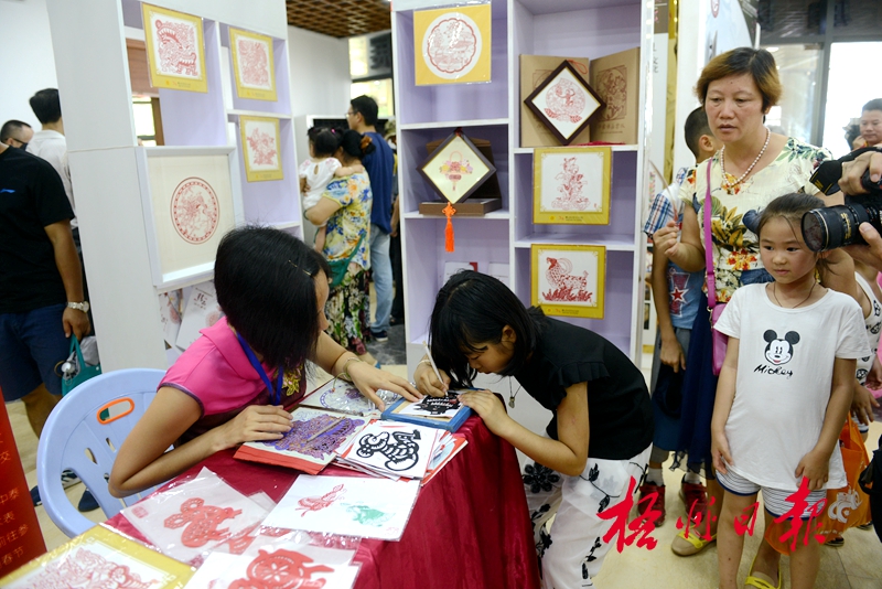 ??? 6月11日,在桂粵非遺大觀園廣東館,一位小朋友在民間藝人的指導(dǎo)下學(xué)習(xí)剪窗花。