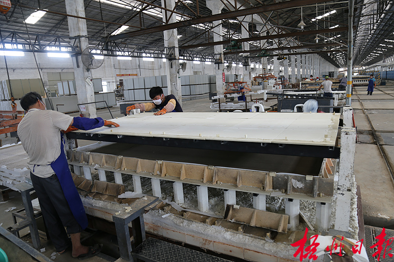 ????在廣西碳歌環保新材料股份有限公司燒成車間,工人正在對陶泥漿粉進行定型、烘干操作,生產發泡陶瓷保溫板。 陳可夫 攝