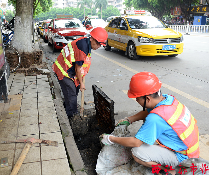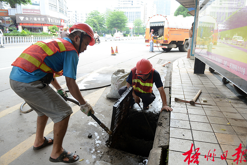 ????6月15日,在新興二路,市政工人正在疏通路邊的排水渠。