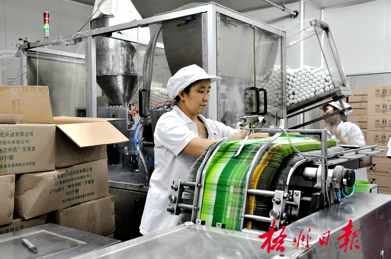 ??? 6月20日,在梧州工業(yè)園區(qū)奧奇麗公司牙膏生產車間,經過制管、制膏、灌裝、包裝等生產環(huán)節(jié),一盒盒印制著“田七”品牌的牙膏產品源源不斷下線。