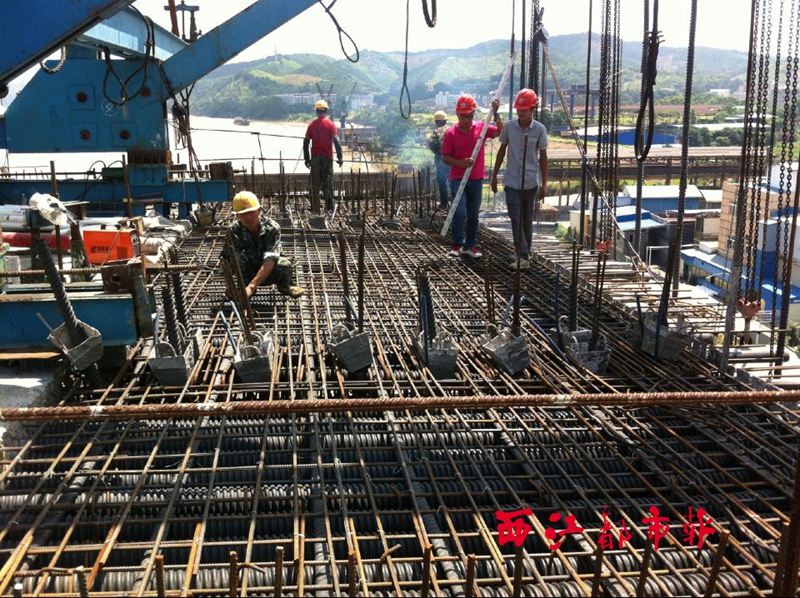 ?6月21日,施工人員正在西江三橋10號(hào)主墩綁扎鋼筋。