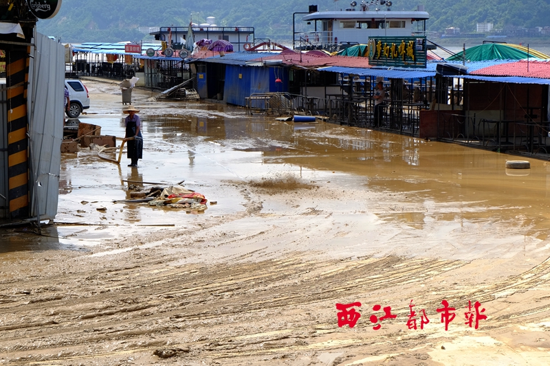 ??? 6月22日,河西老碼頭食肆一帶,有市民在清理地面的淤泥。