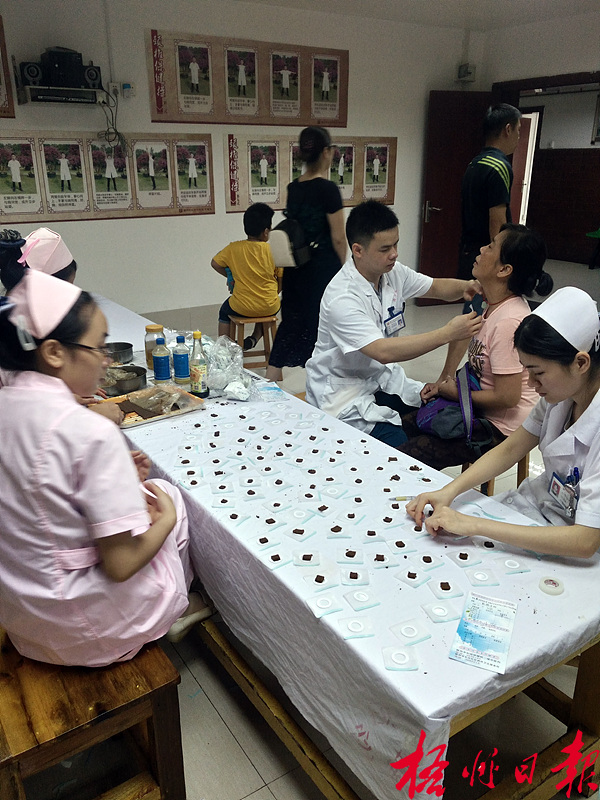????“我關(guān)節(jié)痛,所以過來做三伏貼。”“醫(yī)生,幫我在腰這里做三伏貼。”6月21日,夏至當(dāng)天,在梧州市婦幼保健院中醫(yī)科的一間診室里,兩個醫(yī)師忙著給前來就診的市民做三伏貼,一旁還有不少市民在排隊等待著,而在旁邊的診室里,幾個市民正在做著長蛇灸。據(jù)了解,自入夏以來不少市民來到該院做三伏天灸以及長蛇灸,夏至當(dāng)天,前來做灸療的市民更多。“大家都想冬病夏治,所以這幾天院里預(yù)約不斷。”梧州市婦幼保健院中醫(yī)科醫(yī)師李雪玲表示,夏至前幾天就有不少市民預(yù)約,平時來做長蛇灸的人一天都有5到6個,而夏至當(dāng)天則有8到10人。