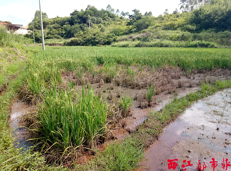 古祀村部分水稻被柴油污染后出現(xiàn)死苗的情況。蒙敏瑩/攝