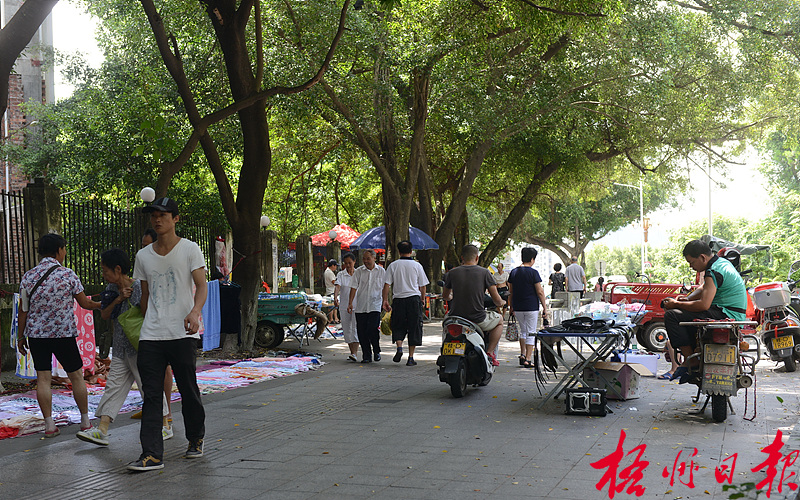 ????近日,在桂江一橋河西橋頭,小販在人行道上擺賣。