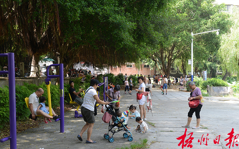 ????高溫高濕的“桑拿天”已持續較長時間,上午9點左右太陽已相當猛烈。記者看到,外出到各個公園游玩的市民都選擇到大樹下遮蔭乘涼,開展各種健身活動。 李鴻榮 攝
