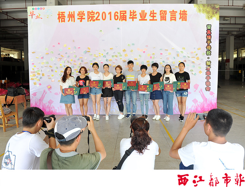 留言墻上貼著臨別的祝福,不少畢業(yè)生在此合影留念。 (西江都市報(bào)記者 陳健新/攝)