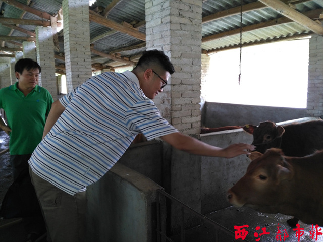 “你這里養(yǎng)的是什么牛?賣出一頭牛能賺多少錢?” 剛到埠,許勁毅一邊問,一邊摘下眼鏡用袖子擦著額頭上豆大的汗珠。張金熟絡(luò)地向他介紹道,自己養(yǎng)的是黃牛和水牛,一共12頭,專門賣出去做食用的。牛都是從貴港平南縣買回來,一頭牛買入的價錢是3000元,如果生長順利,養(yǎng)一年后可以賣得6000元的價錢。