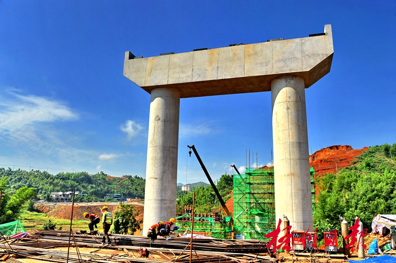 ??? 7月7日,在環城高速公路西江特大橋工地,工人正開展引橋系梁、墩柱、蓋梁施工。