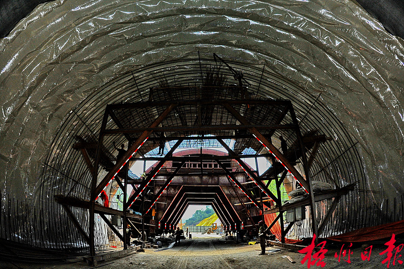 ????7月10日,在環城高速公路下潭隧道工地,工人正進行洞壁二次襯砌。