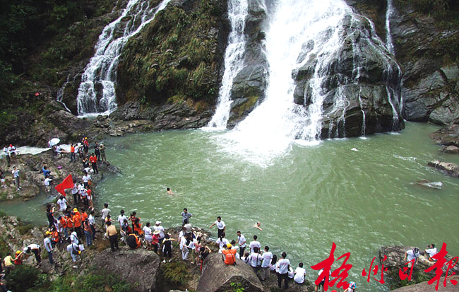 ????走近白霜澗瀑布時,在山邊就聽見嘩嘩的流水聲,循聲望去,只見從山上飛流而下的瀑布,它讓我們情不自禁地想起李白的“飛流直下三千尺,疑是銀河落九天”的詩句來,人們稱它為“桂東第一瀑”也不為過。白霜澗瀑布,瀑布寬20多米,分三級奔流而下,氣勢浩大、潭瀑交錯、水聲轟鳴、水霧蒸騰。從一個落差80多米的高處飛流而下,瀉在巖石上,濺開的水花,潤濕山間一草一木,花草也被洗得一塵不染,仿佛進入了人間仙境。觀瀑的人們在連連的驚嘆之外,也紛紛舉起手中的相機、手機抓拍這一壯觀的美景,在瀑布前,人們輪流拍照,留下自己美麗的倩影,攝下精彩而又永恒的瞬間。