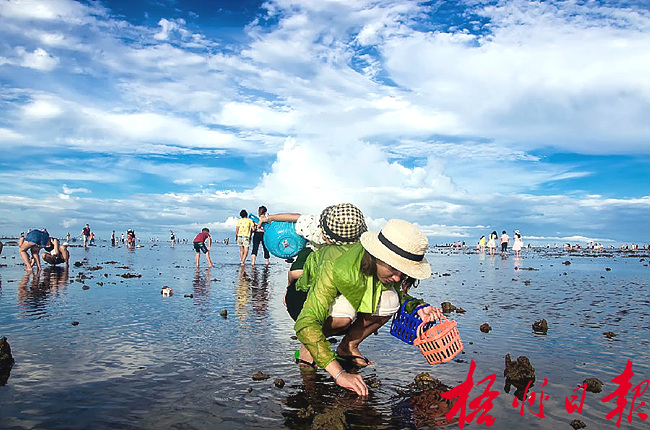游客在潭門灣趕海。