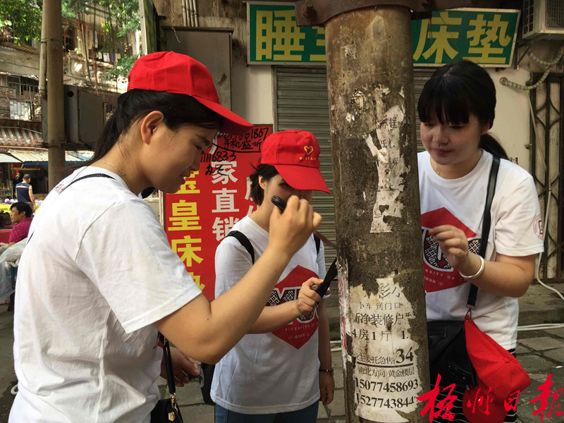 7月16日 ,在新興菜市附近街巷,青年志愿者們在清理“牛皮癬”。當天,青年清理城市“牛皮癬”統一行動在全市近40個社區開展,近800人參加此次行動。 羅銀妮 攝