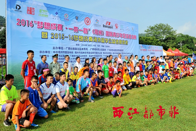 ??? 西江都市報訊(記者 楊珊 通訊員 黃能)10多個國家和地區、75支青少年足球隊、近2000名參賽運動員……7月18日,2016“夢想成真·一帶一路”(梧州)國際青少年足球邀請賽暨2015—2016年度“夢想成真”赴英國留學公益計劃終選活動,在梧州國家體訓基地隆重開幕。在接下來的一周里,來自國內外的足球小將在綠茵場上一決高下,共同演繹一場精彩紛呈的足球盛會。