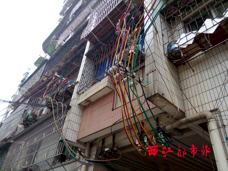 ????申先生家窗戶底下的電線共有24根,緊貼著43號住宅樓的1、2、3號樓二樓住戶陽臺墻體。由于自家窗戶與兩排電線接駁處的距離比較近,申先生感到擔心,“家里有老人和小孩,如果在窗戶外晾衣服時不小心碰到這些電線,或者雨天打雷,有可能造成嚴重的后果。”他說,電線是半年前拉的,當初供電部門拉線的時候應該要考慮電力設施與住宅樓的安全距離。