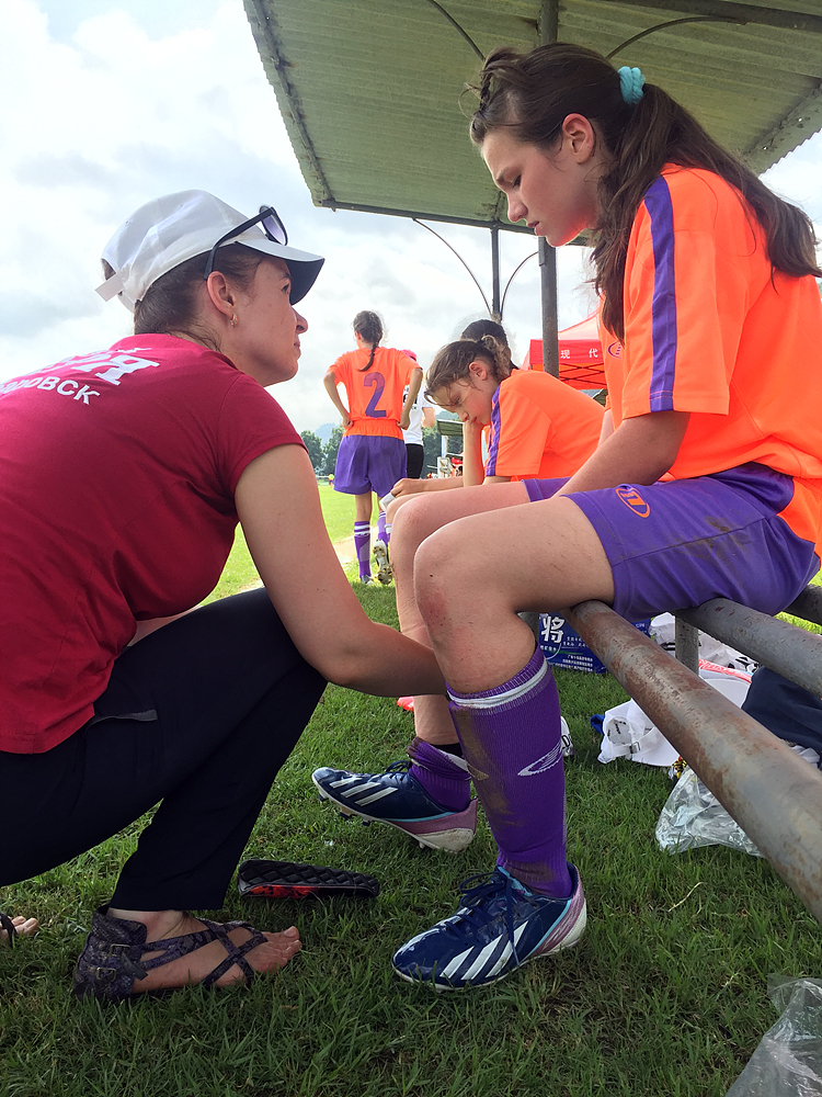 在激烈的對抗中,俄羅斯隊一名隊員受傷,教練立即為其進行緊急治療。記者 楊珊/攝