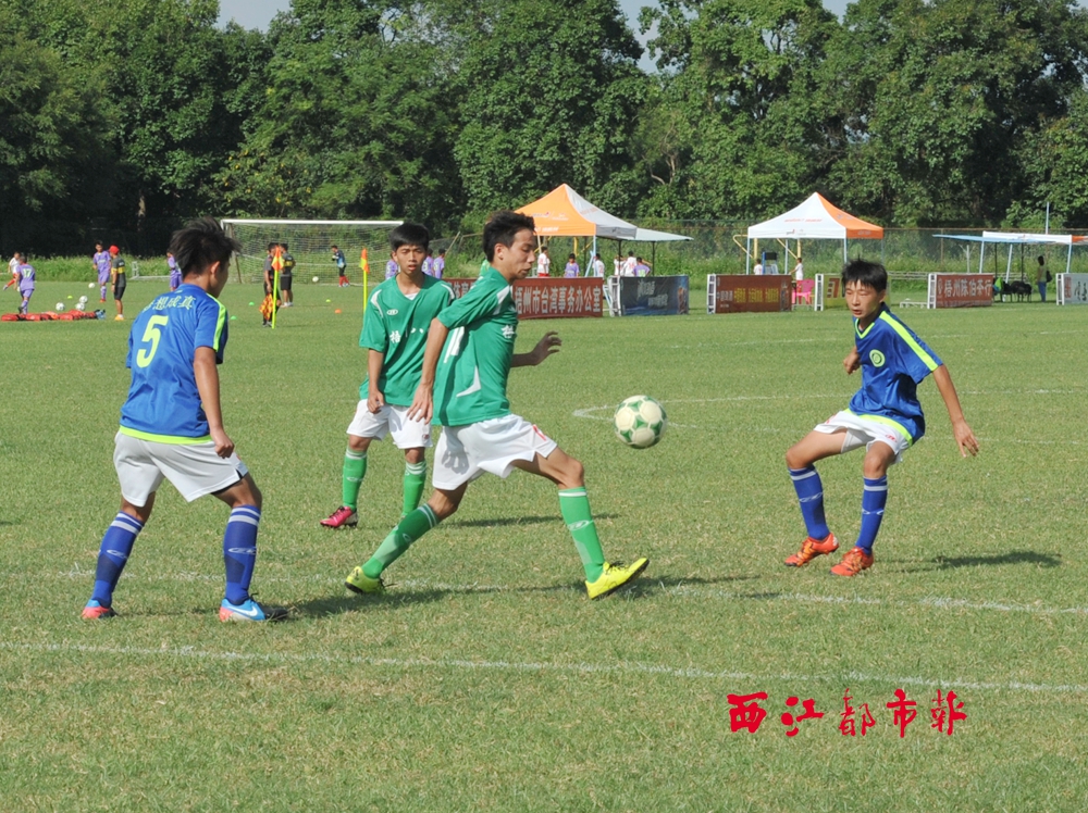 在夢想成真隊與梧州八中一隊的U16男子足球比賽中,八中隊隊員(右二)在突破對手的防線。 西江都市報記者 陳健新/攝