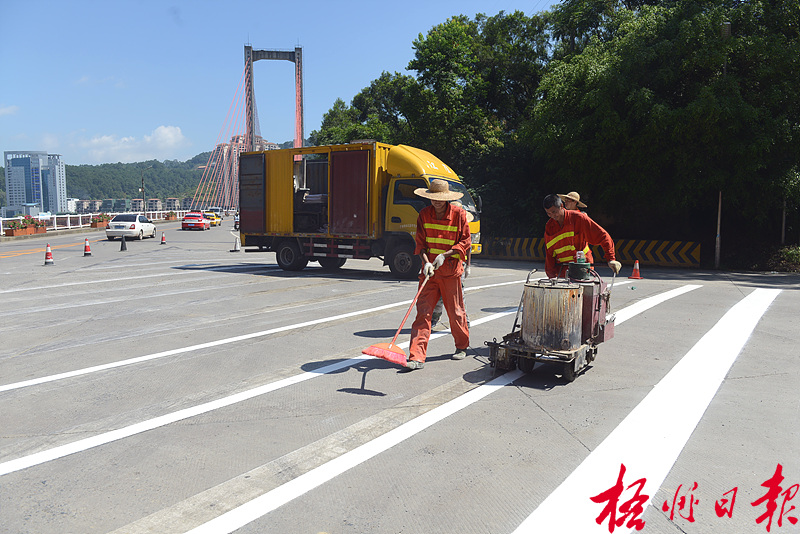 ??? 近段時間,市政路橋部門對市區橋梁以及兩端橋頭的路面行車標線重新漆劃,以規范車輛行駛。李鴻榮 攝