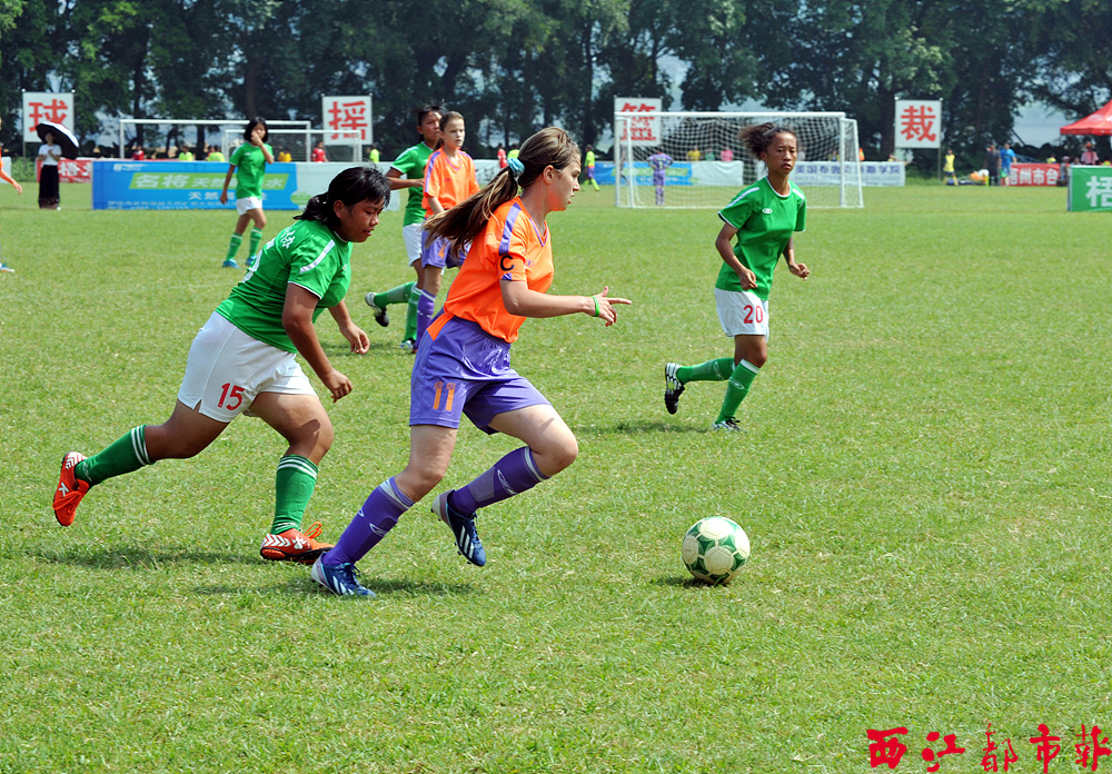 在U15年齡組女子賽中,俄羅斯隊員(橙色服)突破順德足協隊的防線。