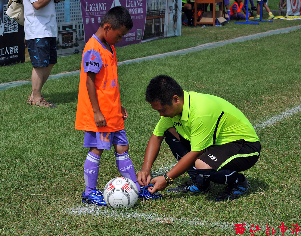 熱心的裁判員俯身為鞋帶松了的小隊員系鞋帶。