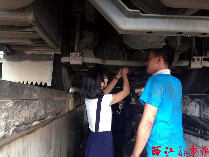 西江都市報記者在機修師傅的指導下給車輛上底盤螺絲。葉穎/攝