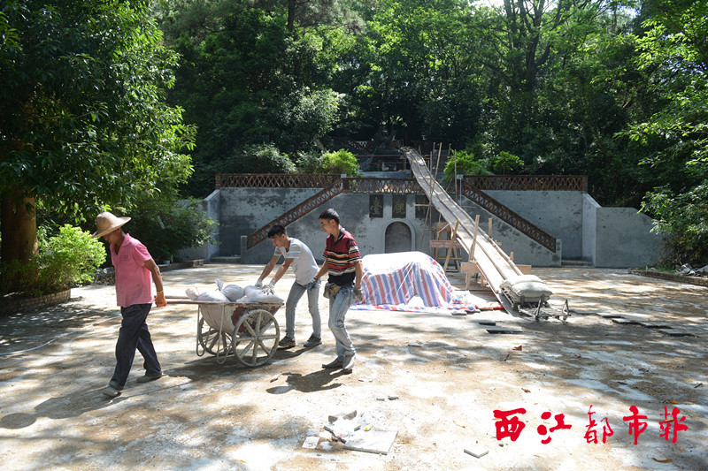 7月29日,在白云山景區內,工人正在神鹿臺開展施工作業。