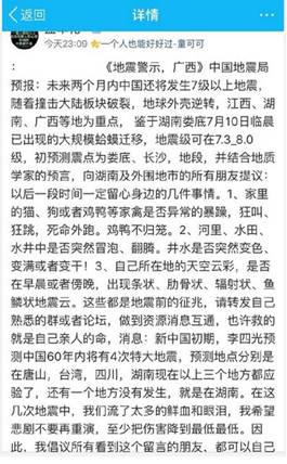 北京時間7月31日17時18分, 梧州市蒼梧縣(北緯24.08度,東經111.56度)發生5.4級地震,震源深度10千米。除梧州外,南寧、桂林、欽州、河池環江、柳州均有震感,其中賀州震感強烈,沒有收到人員傷亡財產損失報告。地震發生后,在互聯網上出現一則題為《地震警示,廣西》的地震謠言,內容大致為:“中國地震局預報:未來兩個月內中國將發生7級以上地震,隨著撞擊大陸板塊破裂,地球外殼逆轉,江西、湖南、廣西等地為重點,地震震級可能在7.3~8.0級。” 據調查,幾年前已有類似的“預測內容”流傳,除地震發生點不斷變化外,其余文字內容基本一致。近期,該則謠言在湖北、江西等地流傳,湖北省地震局、江西省地震局已先后在互聯網發布辟謠信息。據湖北省地震局證實:謠言散發者王某已于6月29日被湖北省公安機關抓獲并予拘留5日的處罰。梧州市網警已加強網上巡查,對謠言信息進行溯源,惡意造謠者將依法處理。 再次提醒廣大網友勿信謠、勿傳謠,欲了解有關此次地震的相關信息請關注官方機構及媒體。