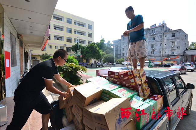 8月1日上午,在蒼梧縣沙頭鎮政府,工作人員將救災物資裝上皮卡車,準備運送至一線災區。西江都市報記者 趙洋/攝
