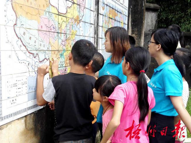 8月6日,在蒙山縣黃村鎮(zhèn)林秀小學(xué),廣西籍在京大學(xué)生志愿者為學(xué)生開(kāi)設(shè)國(guó)防教育課。 8月1日開(kāi)始,共青團(tuán)廣西區(qū)委員會(huì)、梧州市委員會(huì)等單位共同舉辦暑期京桂學(xué)子青春扶貧蒙山實(shí)踐活動(dòng)。八名廣西籍在京大學(xué)生來(lái)到林秀村,為留守兒童開(kāi)設(shè)暑期課堂,講授國(guó)學(xué)經(jīng)典和環(huán)璄保護(hù)等課程,并利用空余時(shí)間進(jìn)行學(xué)生家訪、關(guān)愛(ài)孤寡老人等活動(dòng)。 周嵐 攝