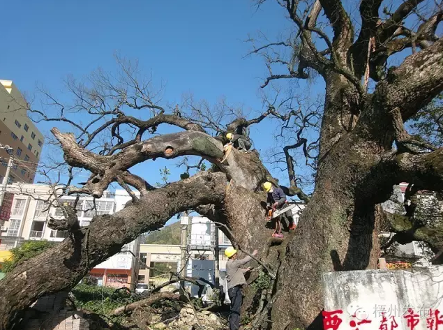 2015年,在岑溪市樟木街東出口,園林工人正處理一株古樟樹的枯枝。據悉,這株古樟樹樹齡超過500年,最近出現黃葉、干枯等現象,瀕臨枯萎死亡,該市園林部門采取清理枯萎樹枝、修補樹洞、清除樹下雜物、更換土壤、改善排水、加設護欄等救護措施確保樟樹存活。 吳燕妮 攝