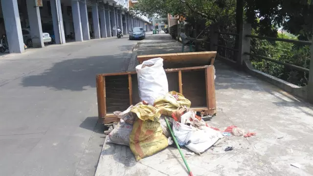 ????當天現場堆積的垃圾中,還有一個廢棄的木柜和一些木板。