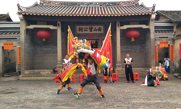 表演隊伍在南山曾公祠堂外表演非物質文化遺產舞麒麟。