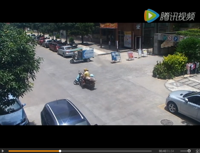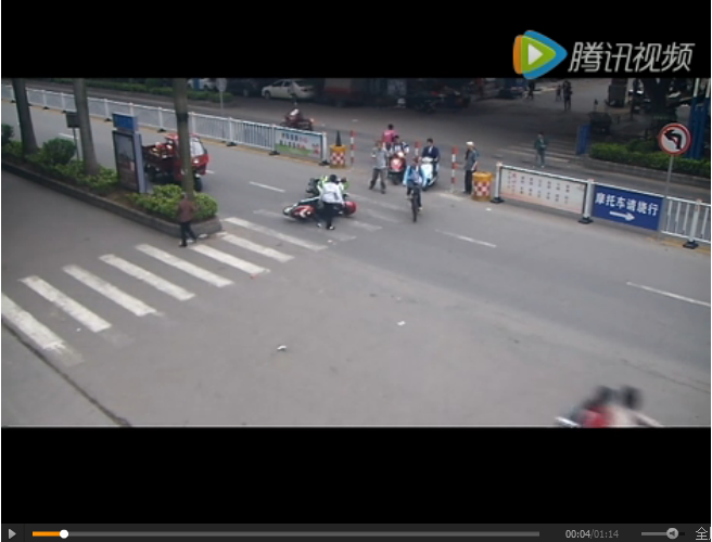 ????事發路段為金湖北路鳳凰臺小區門口,一輛電動車緩慢通過馬路時被直行的摩托車撞倒,電動車司機被撞得站不起來。(點擊上圖可觀看視頻)