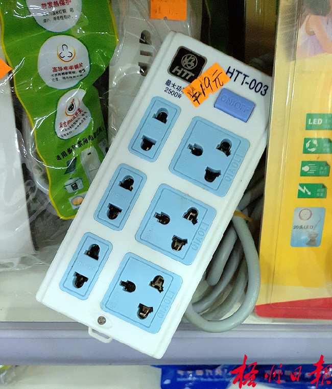 ????8月9日,記者在大東路一雜貨店看到仍有“萬(wàn)能插座”銷(xiāo)售,“萬(wàn)能插座”屬于淘汰產(chǎn)品,國(guó)家已明令禁止銷(xiāo)售。 曾韻 攝