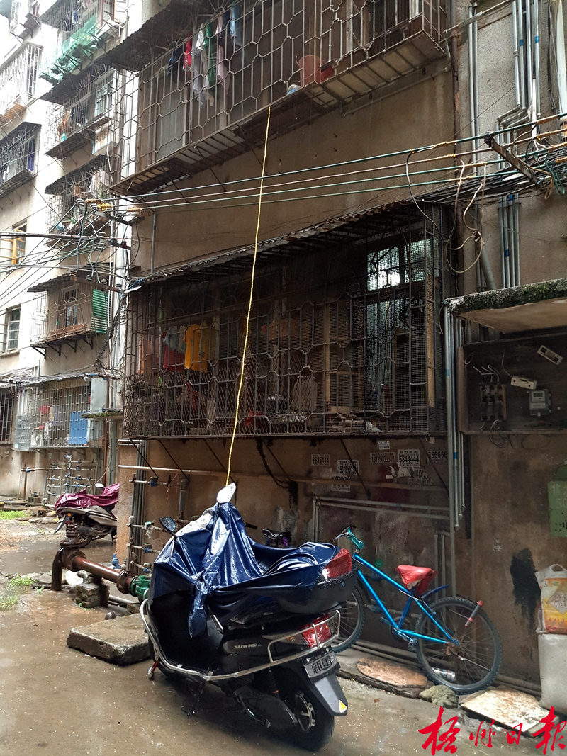8月11日上午,天下著小雨,記者在富民一路華光巷一居民樓前看到,一根電線從二樓“空降”到地面為電動車充電,存在安全隱患。曾韻 攝