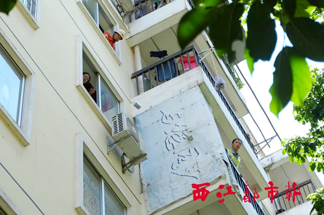 ?一在公安干警的勸說(shuō)下,將自己反鎖在房間內(nèi)的女事主,終于主動(dòng)將鑰匙放進(jìn)一個(gè)罐頭內(nèi)扔下樓,讓營(yíng)救人員開(kāi)門。 西江都市報(bào)記者 何鎏/攝