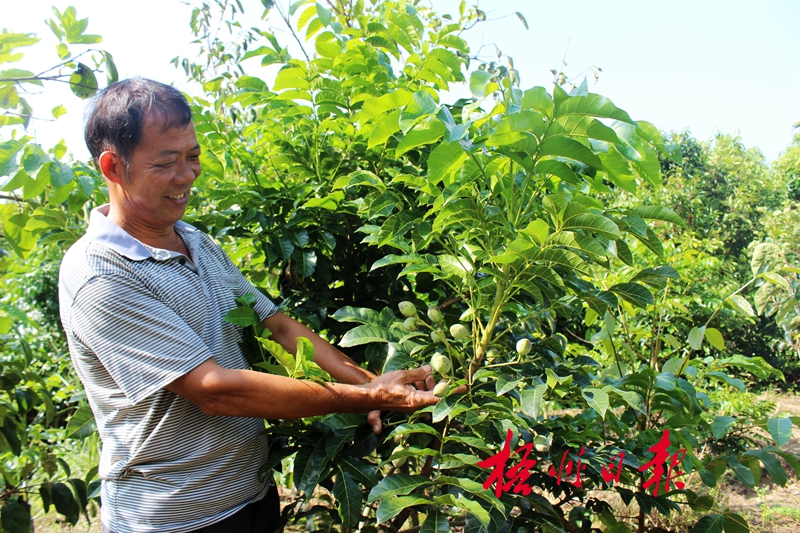 ????8月11日,岑溪市波塘鎮和村農民歐顯似正在察看自家種植的工藝欖長勢。