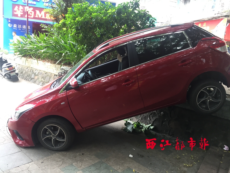 事發(fā)后,小車的后車輪還卡在一米多高的花壇上。(鄧發(fā)浩/攝)
