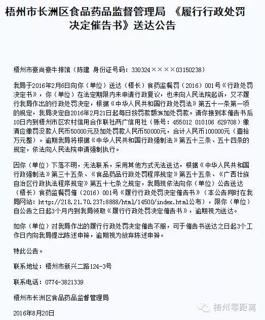 ????隨后,零妹也向長洲區人民法院進行了咨詢,相關工作人員解釋,該事件中的涉事單位如果逾期仍未履行處罰決定,長洲區食藥監局可以向法院申請強制執行。鑒于其(單位)下落不明,可將其銀行賬戶凍結直接扣款,或是對其名下財產強制執行變賣。
