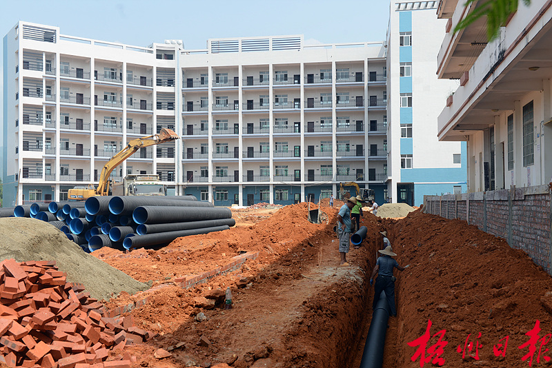 ????8月24日,在萬秀區夏郢鎮夏郢二中,工人在操場鋪設排污管道。