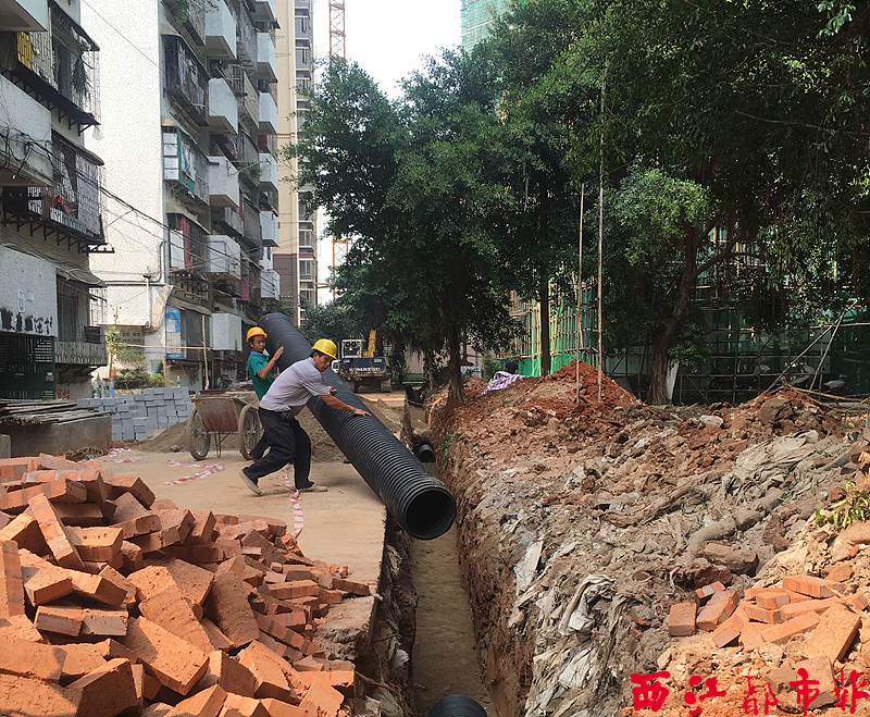 8月25日,在松脂廠生活區內,工人正在為小區鋪設新的排污管道。西江都市報記者 謝韻/攝