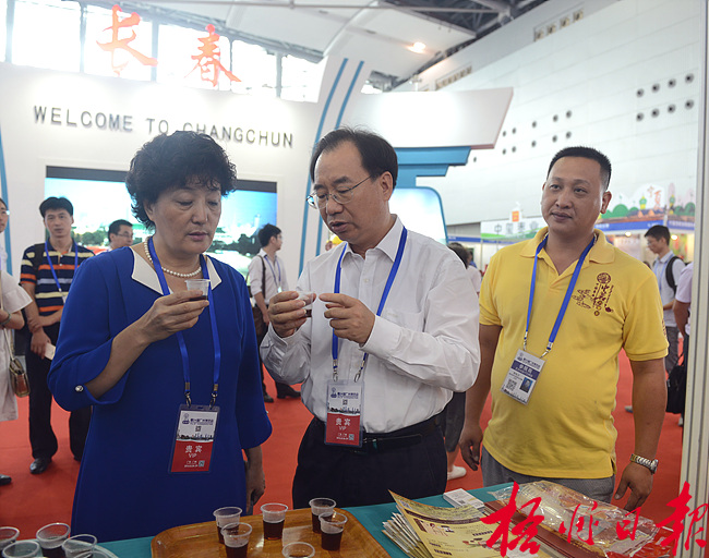 8月26日,在廣州博覽會會場,市長朱學慶向參展嘉賓推介梧州六堡茶。李鴻榮 攝