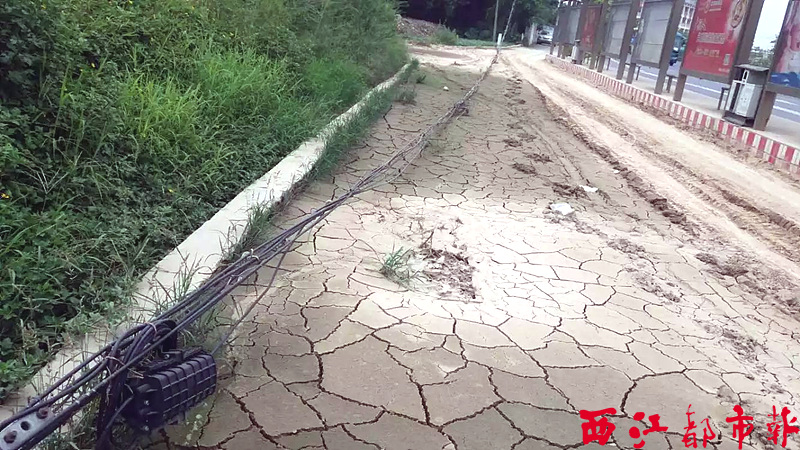 ????該公交站背后的人行道上,長約300米的線纜掉落在人行道的黃泥里,線纜上是曬干了的泥漿和厚厚的灰塵。