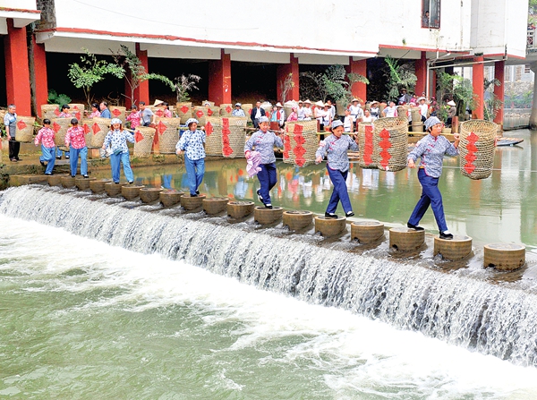 茶農把一擔擔六堡茶送到合口碼頭,還原當年通過“茶船古道”外輸六堡茶的情景。西江都市報記者 陳健新/攝