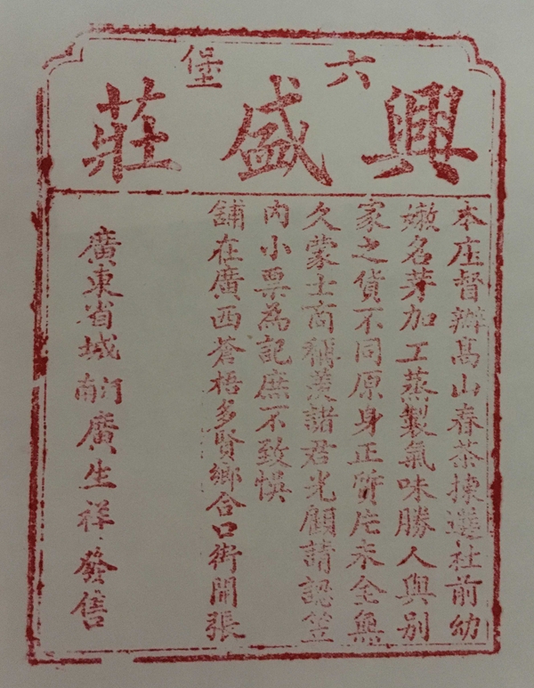 當時,“興盛莊”的生意非常紅火,每次收茶制茶,“興盛莊”都要臨時請二十多個工人,負責在茶亭里面炒茶、制茶。當時“興盛莊”的茶亭比較大,占地有300多平方米,在馬練坪(六堡鎮的一個地名)下面,茶亭里又住人又制茶,還做倉庫。那時候,擔茶出來的茶農絡繹不絕,有時候,賣茶還要排長隊。