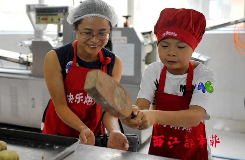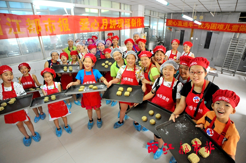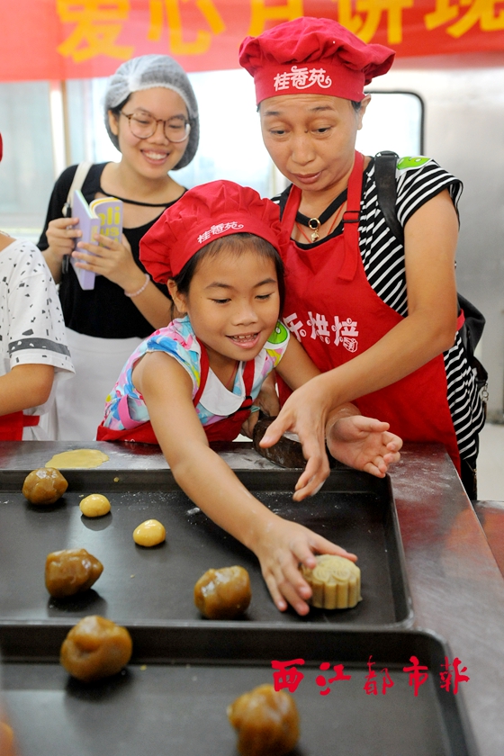 8月28日,月餅打好了,即將送入烤箱前,家長(zhǎng)和孩子們開心地端著自己制作的月餅合影。當(dāng)天,由西江都市報(bào)與梧州桂香苑食品有限公司聯(lián)合舉辦的“我為困難家庭做月餅”愛心活動(dòng),在桂香苑公司制作工廠內(nèi)舉行。來(lái)自梧州市的15個(gè)愛心家庭在這里親手制作了約60只月餅。這些月餅,將被送到藤縣象棋鎮(zhèn)留村的困難戶家中,讓他們度過一個(gè)溫暖的中秋佳節(jié)。