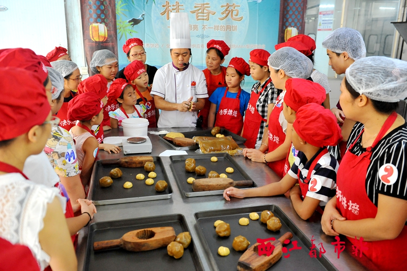 ?桂香苑公司派出專業(yè)師傅為愛心家庭演示月餅制作步驟。