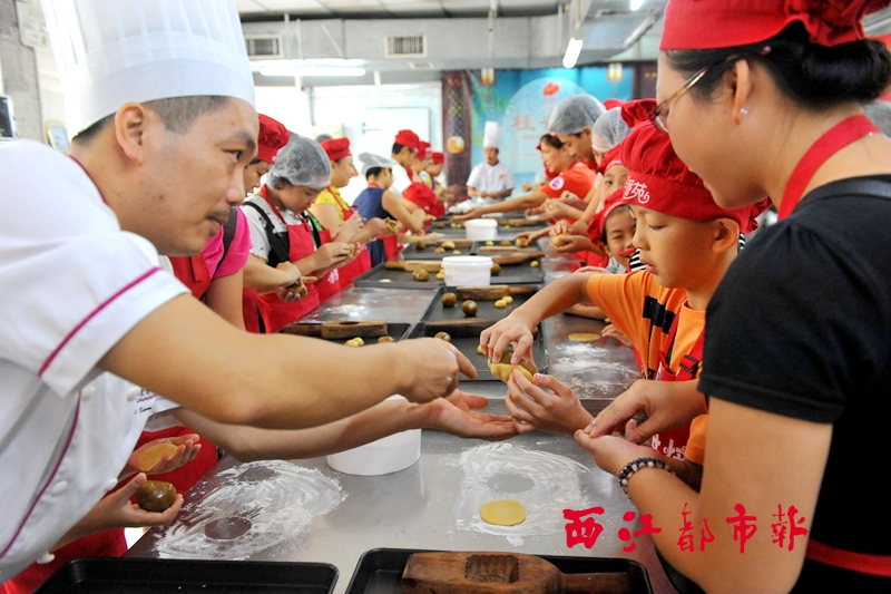 ????由于多數(shù)家庭都是第一次制作月餅,看到這些專業(yè)烘焙用品,大家好奇之余,有些不知所措。當(dāng)西點(diǎn)班的主管蘇照搏開始示范如何做月餅時(shí),大家熱情地圍在他身邊,生怕錯(cuò)過任何細(xì)節(jié)。