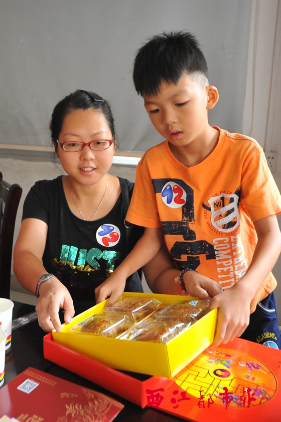 孩子和家長(zhǎng)把月餅包裝入盒。